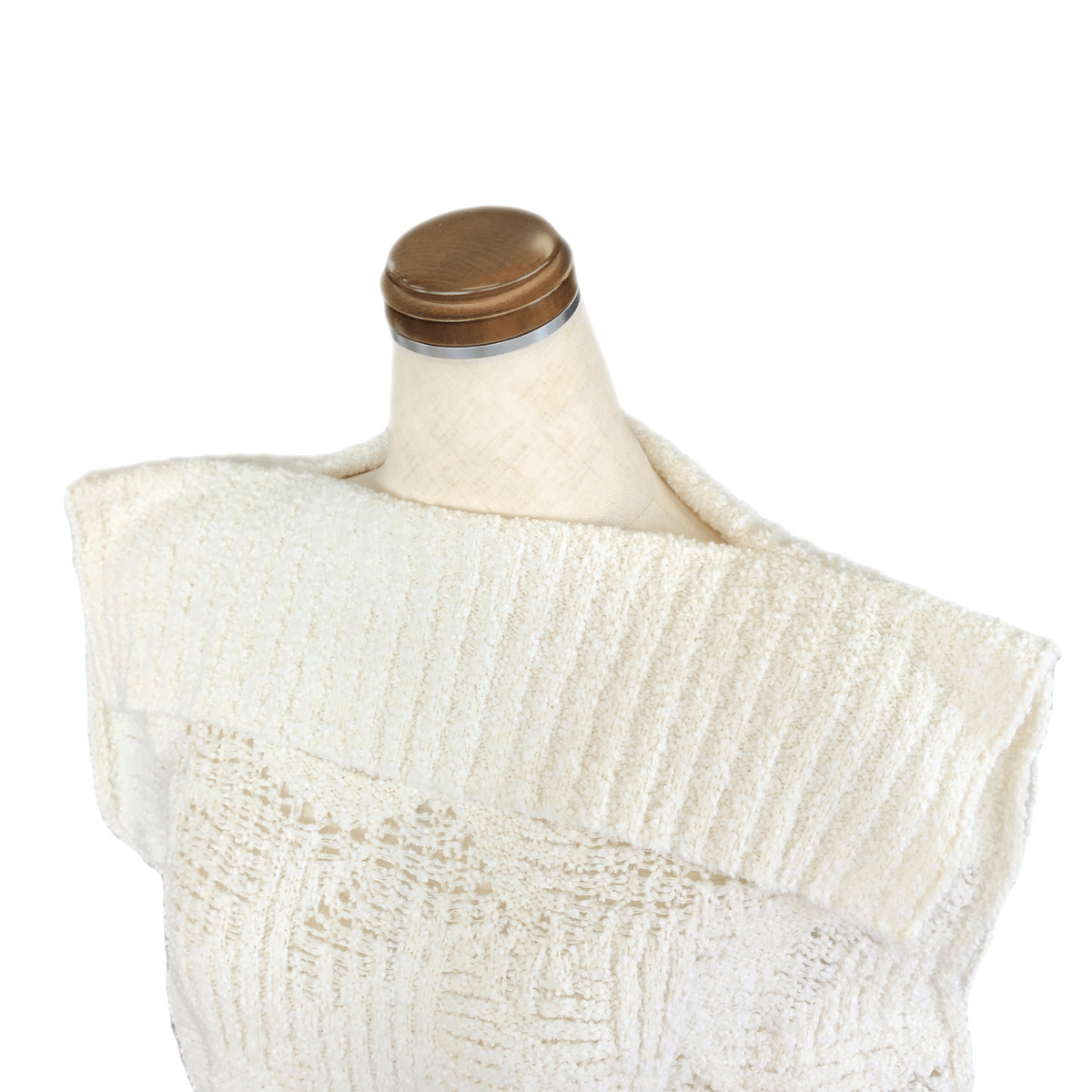 着用していただくと首元の大きなリブ部分が肩に垂れ、上半身に豊かな表情を作ってくれるジャガード・ノースリーブニット。軽やかな抜け感が生まれるボートネック。レイヤリングを楽しんでいただける適度にシアーな網目。