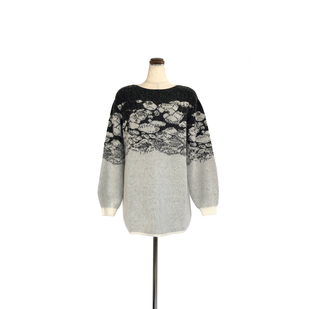 グレイシャー=氷河をイメージした、着るアートなジャガードニット。セミフィットのロング丈、ボートネックで、ゆるやかな抜け感を感じていただけながらモダンに着用していただける、サラパチーニならではの1枚。