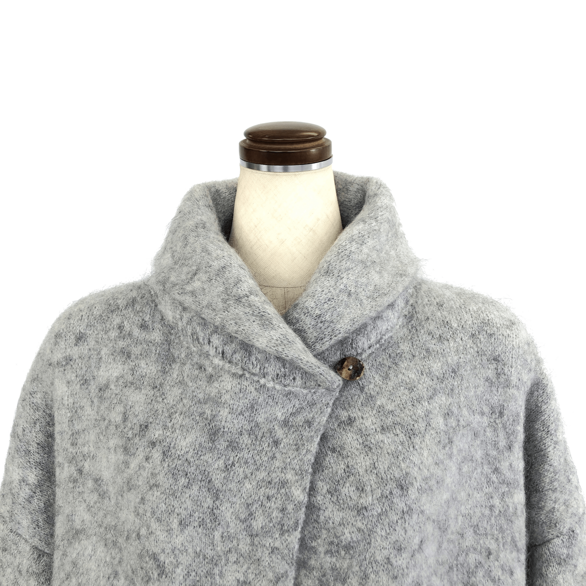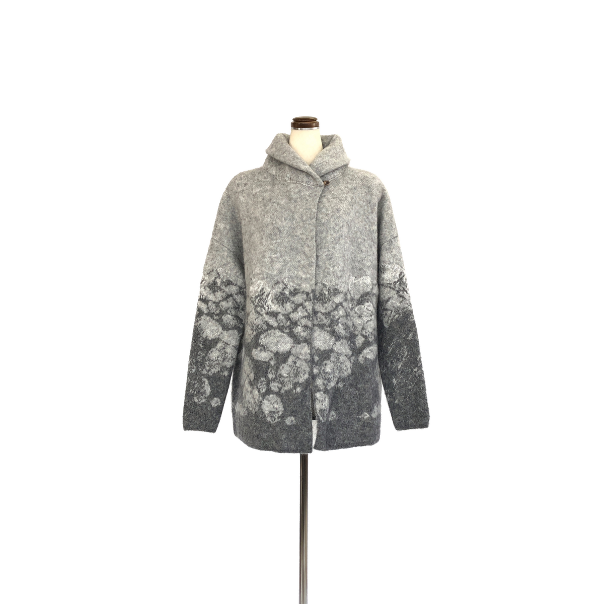 雪を冠した山々の頂が身頃下に広がるジャガード・カーディガン。しんしんしんとした静かな空気感が伝わってくるような風景を身に纏うデザイン。首元を暖かく包み込んでくれるヘチマカラー。
