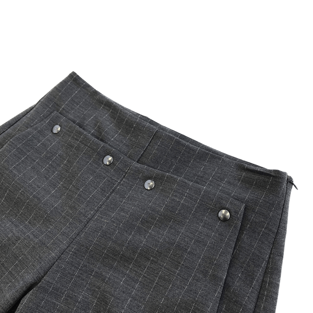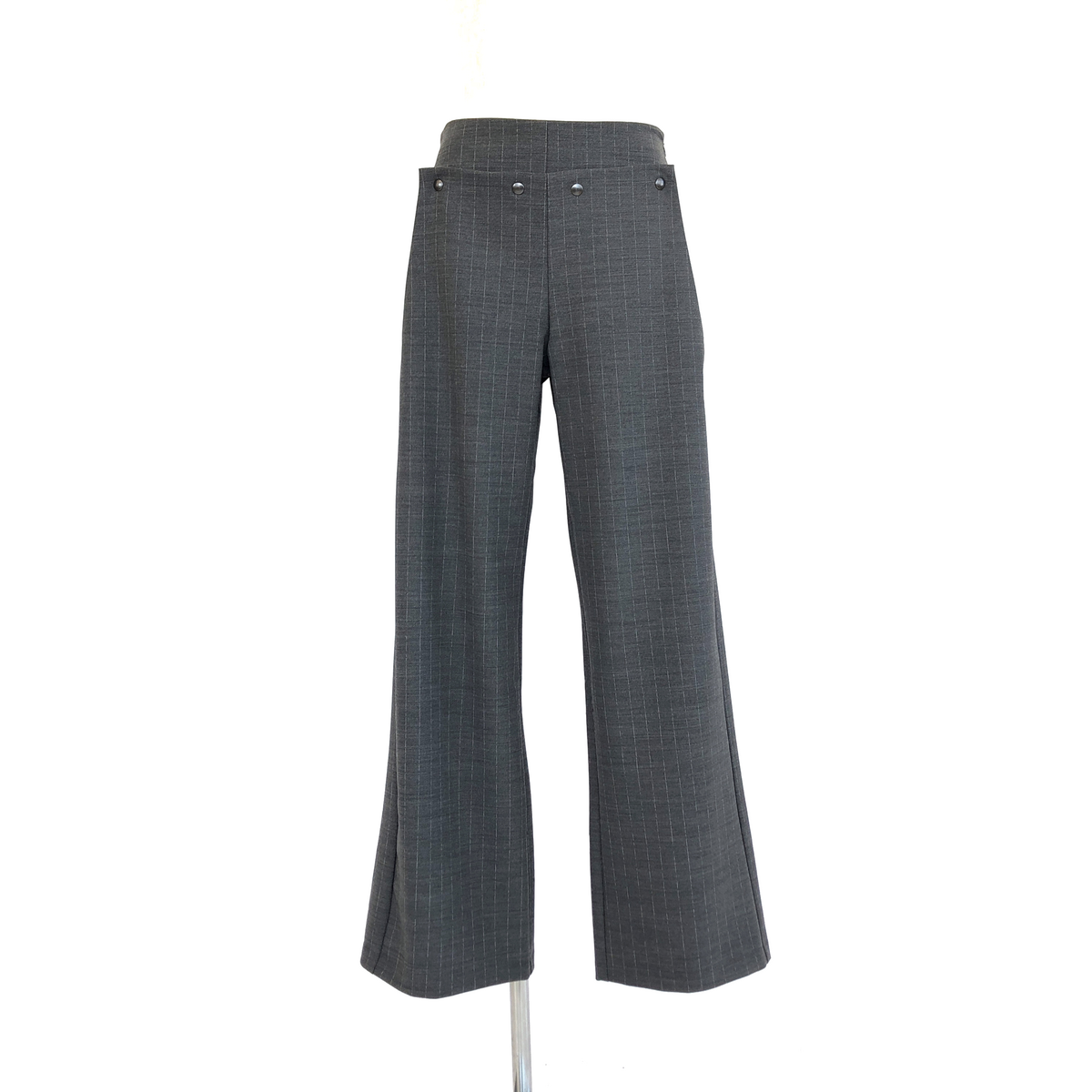 ピンストライプとフロントのボタンフラップが印象的なギャバジン・パンツ。トップスをインしてスタイリングポイントとなってくれる1本です。ウーリーながらもストレッチが効いたワイドフィットで履き心地もイージー。あえてかすれたように表現されたストライプもモダンです。フラップに隠れた両サイドポケット付き。