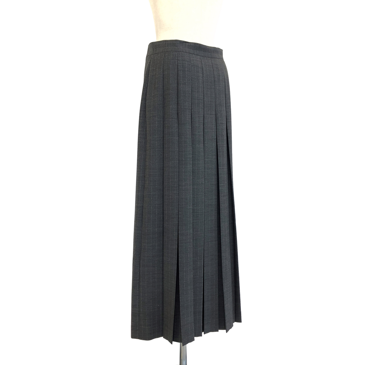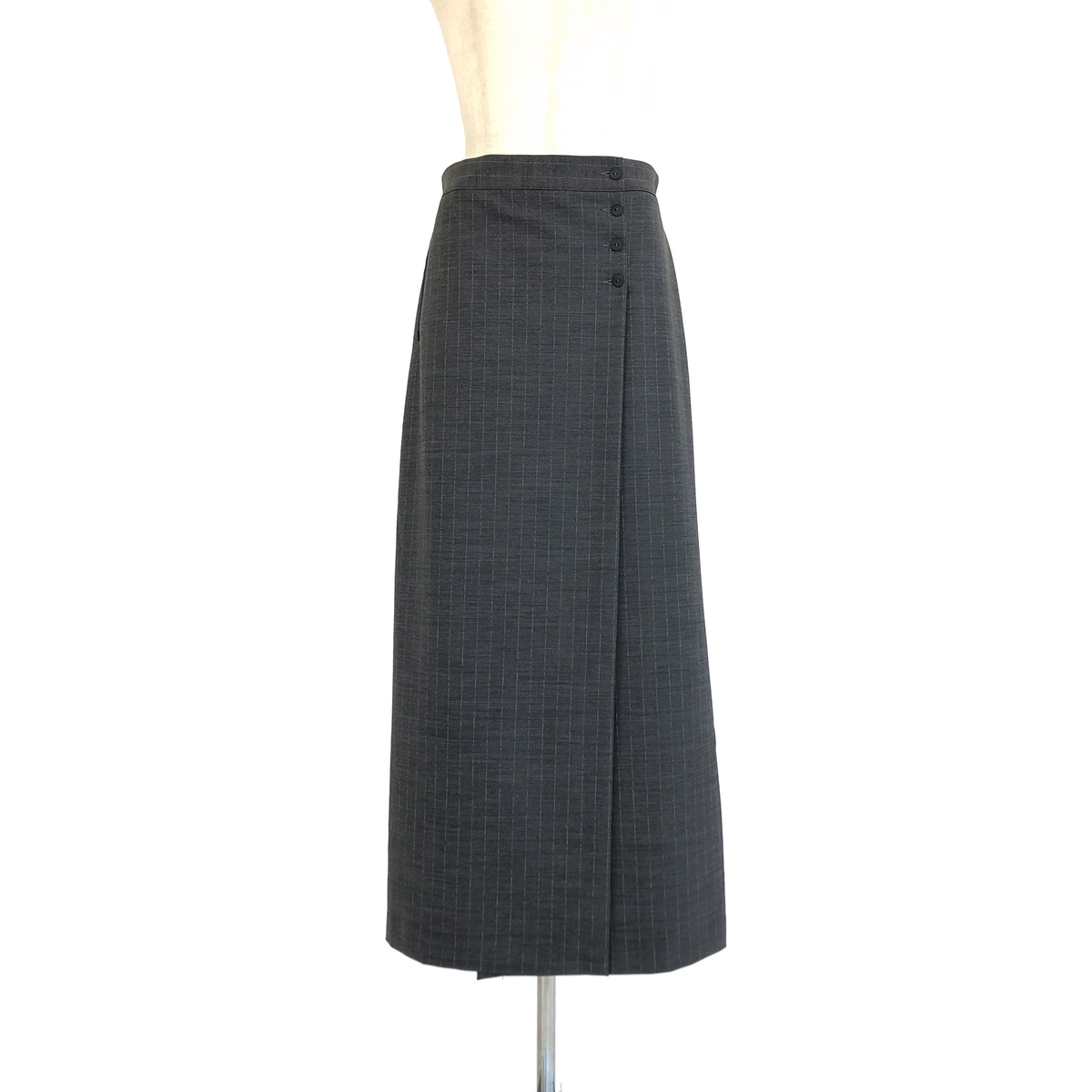 前面はラップボタンと異素材使いの光沢片玉縁ポケットをあしらったシンプルでシックなディティール、背面は歩く度に豊かな表情を生み出すボックスプリーツ仕様という、見る角度によってガラッと表情が変わるマキシ・スカート。ストレッチが効いたウーリーなピンストライプ素材はモダンさと履きやすやを両立。