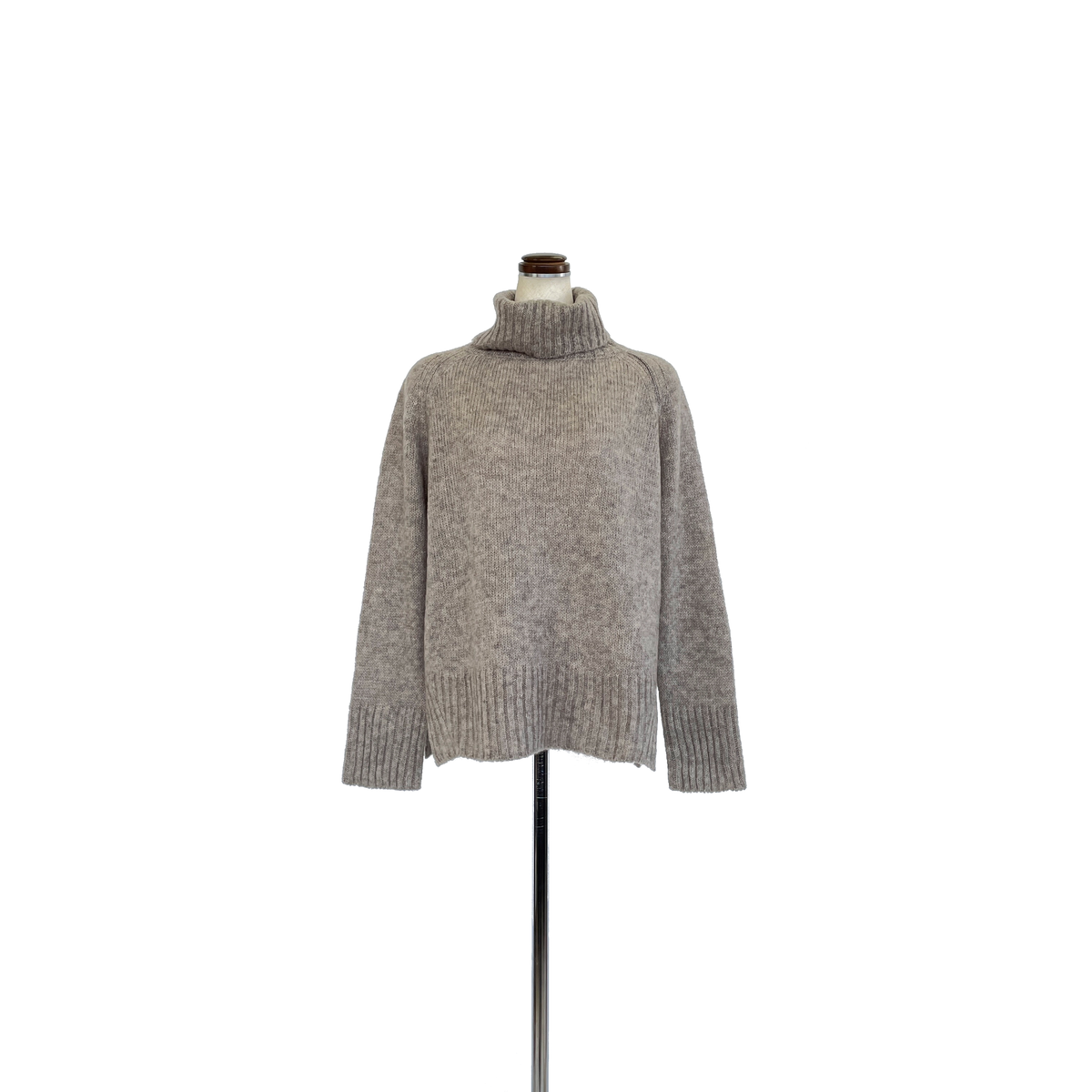 ラグラン左部分に密やかにラメが煌めく、タートルネック・ニット。オフ気味のタートルと、中厚手で、ふんわりとゆるく着用していただけます。裾サイドスリット。
