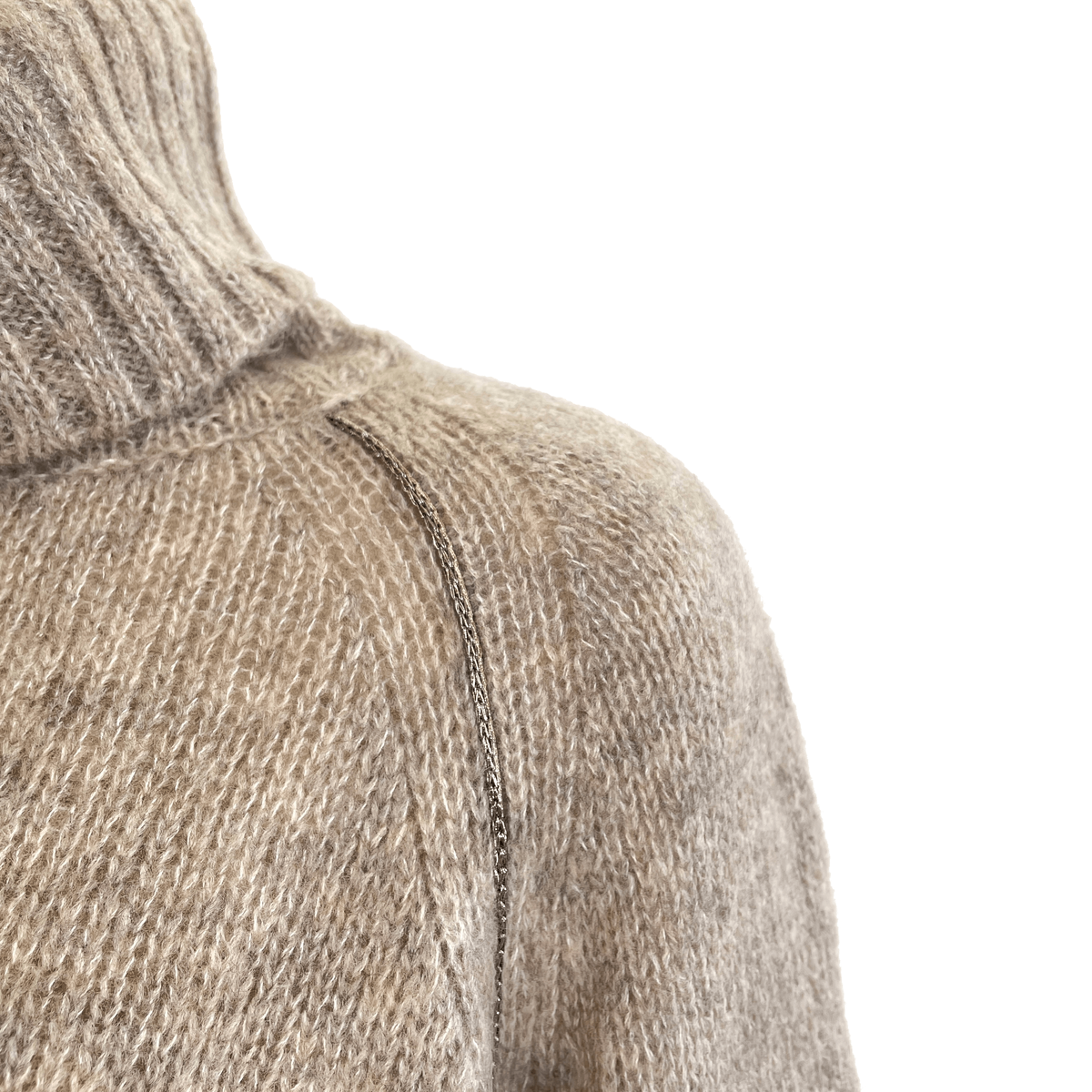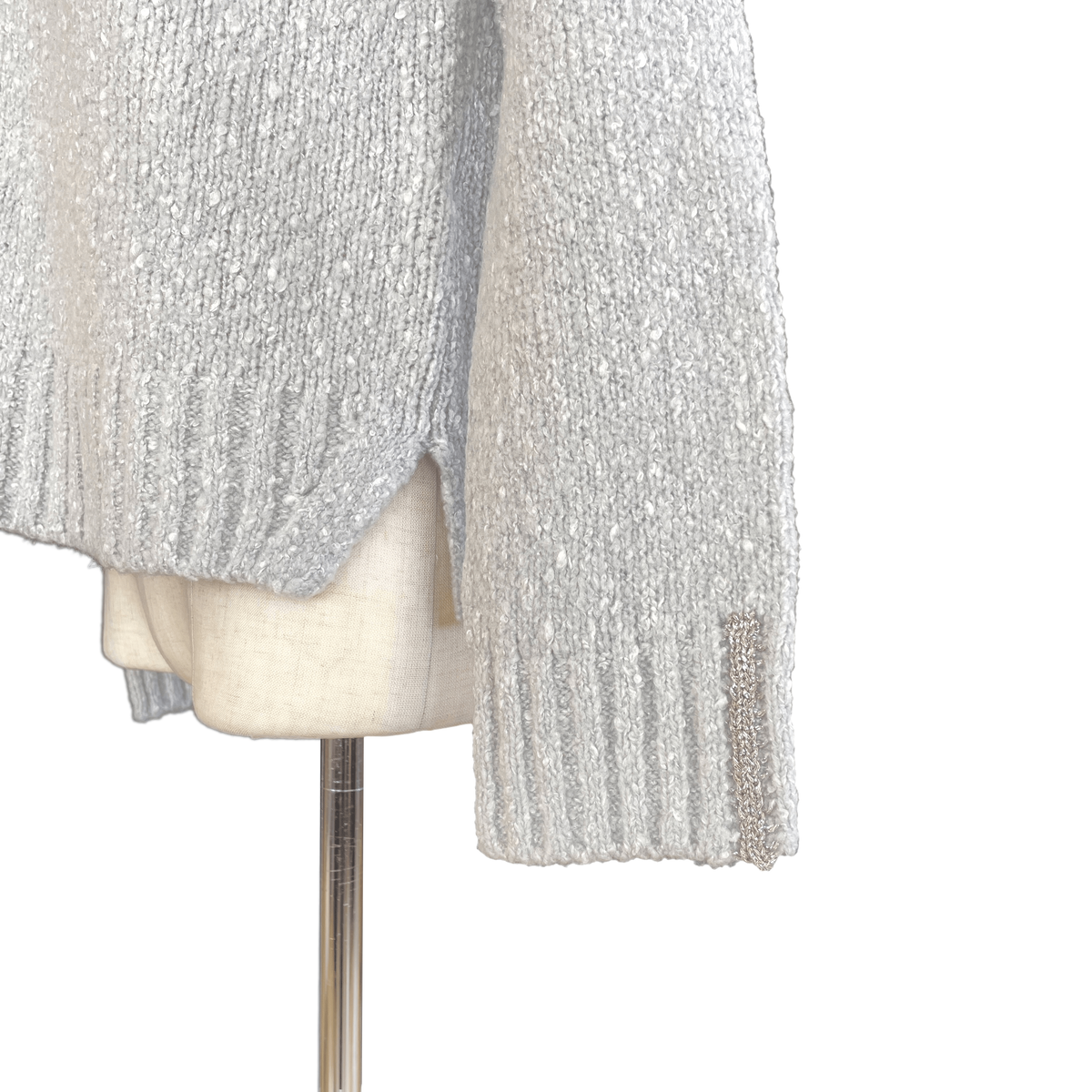 袖口にラメが煌めく、ハイネックニット。メリノウールとシルクの混紡で、適度に湿り気のあるつるっとトロッとした肌触りが気持ちのよい1枚。表情豊かなネップ感のあるローゲージ。