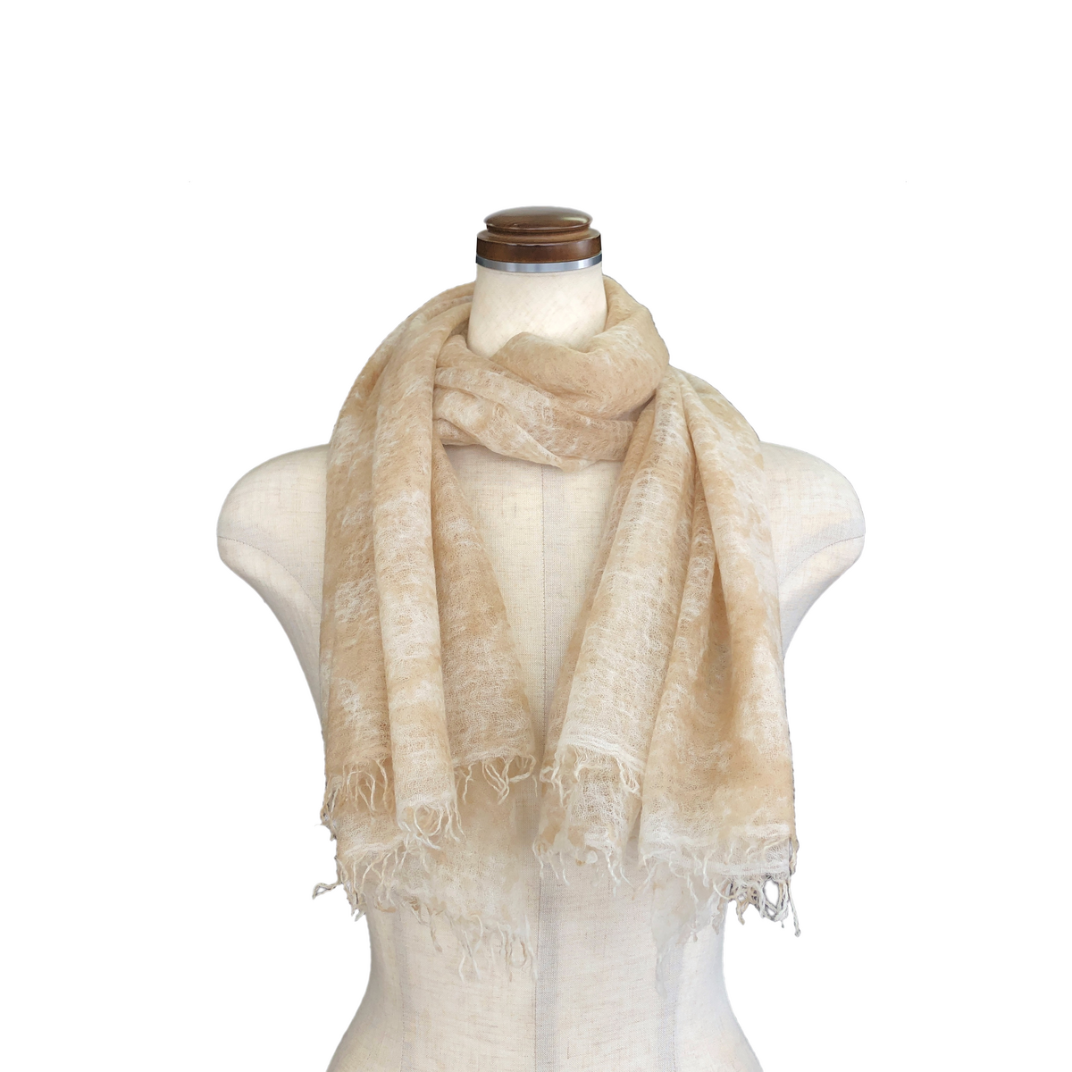 空に投げたらそのまま天へと昇っていってしまいそうな、カシミヤの名門AVANT TOIの技術とクオリティの高さを存分に感じていただけるライトカシミヤスカーフ。淡いカモフラージュ柄が柔らかで穏やかな立体感を生み出します。正方形かつ2辺にフリンジ付きなので、様々なスタイリングを楽しんでいただけます。非常に軽く小さくなるので、まだ肌寒い春先から、冷暖房が効いた夏の防寒にまで、バッグに忍ばせておきたいアイテムです。